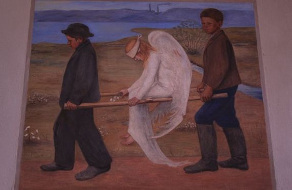 Das Thema des verwundeten Engels hat Simberg schon längere Zeit vorher beschäftigt und er hat viele Skizzen erstellt. Aber der Engel in der Gestalt eines jungen Mädchens und der Hintergrund, eine Landschaft im Eläintarha-Park an der Töölö-Bucht in Helsinki, blieben immer gleich. Das Fresco im Dom unterscheidet sich leicht von dem ursprünglichen Gemälde, das im Ateneum ausgestellt ist: die Wasserfläche ist größer und im Hintergrund sieht man zwei rauchende Schlote.