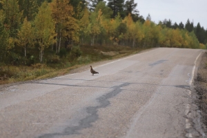 Dann verlaufen wir uns etwas, weil wir einer Treckerspur folgen und nicht genug auf die Kreuze am Wegesrand geachtet haben. Es ist etwas neblig geworden und rundum sieht alles gleich aus. Mit Hilfe der Aufzeichnung des Hinwegs auf dem Handy finden wir zurück, ich hatte zwar den Wanderweg in der richtigen Richtung gesucht, war aber nicht weit genug gegangen, weil wir in Hörweite bleiben wollten. Die Sami haben sich ohne technische Hilfsmittel orientiert, wird uns da bewusst. Als wir zurück am Parkplatz in den VW-Bus steigen, um weiterzufahren, fängt es an zu regnen. Das Schneehuhn auf der Straße hat keine Angst vor Autos, nur fotografieren lässt es sich nicht gern.