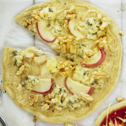 Käsebelag: Crème fraîche mit Senf, Salz und Pfeffer verrühren und auf den Pizzaboden verteilen. Den Apfel waschen und in dünne Scheiben schneiden. Den Käse zerkrümeln. Apfelscheiben und Käsekrümel auf den Pizzaboden geben und im Ofen backen. Gehackte Nüsse und Feigen erst nach dem Backen hinzufügen.