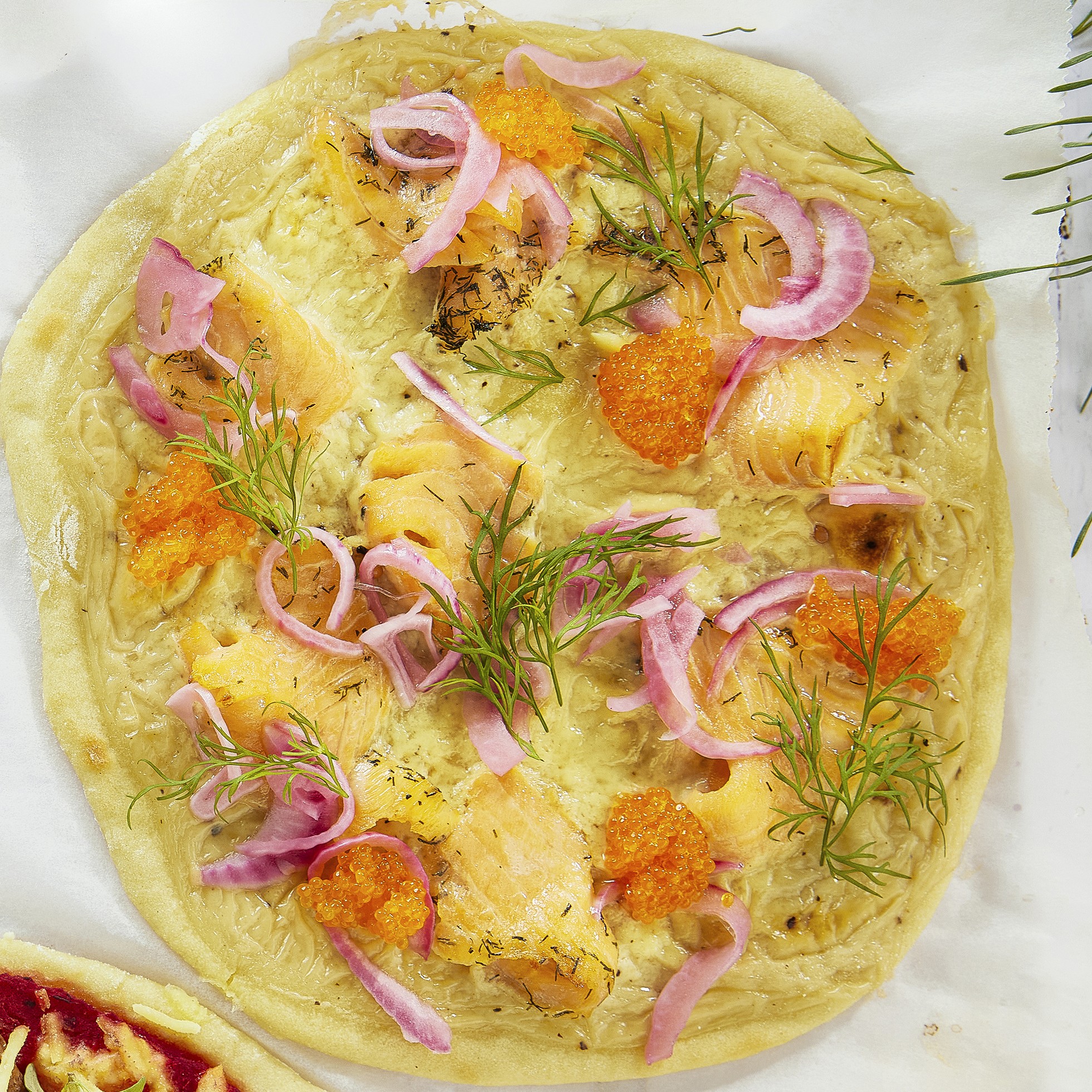 Fischbelag: Crème fraîche mit Senf, Salz und Pfeffer verrühren und auf den Pizzaboden verteilen. Die Zwiebel in dünne Ringe schneiden und auf den Boden geben. Den Fisch kann man nach Belieben vor oder nach dem Backen hinzufügen. Vor dem Servieren ggf. mit Fischrogen und Dill dekorieren.