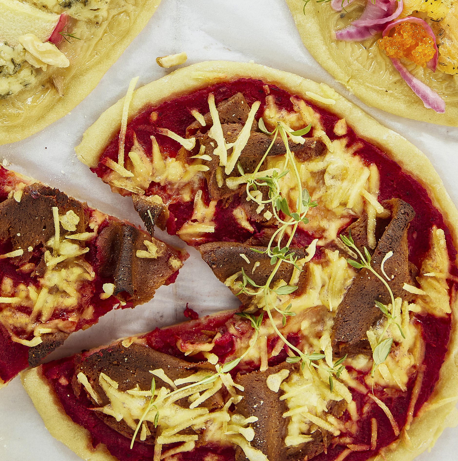 Belag mit Braten und rosolli: Den Heringssalat (rosolli) mit einem Stabmixer fein pürieren und nach Belieben salzen. Das Rosolli-püree wie Pizzasoße auf dem Pizzaboden verteilen. Das Fleisch in dünnen Stückchen und den geriebenen Käse hinzufügen und im Ofen backen.